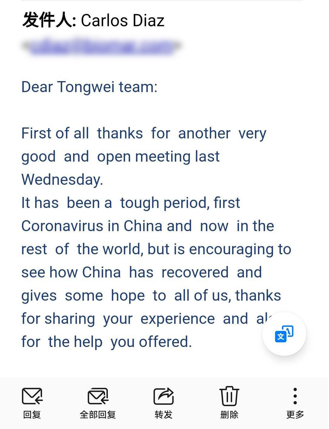 BioMar集團總裁卡洛斯·迪亞茲在郵件中對通威表示感謝