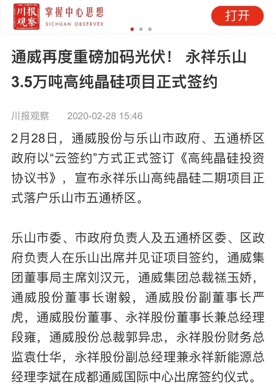 川報(bào)觀察報(bào)道永祥樂山高純晶硅二期項(xiàng)目簽約儀式