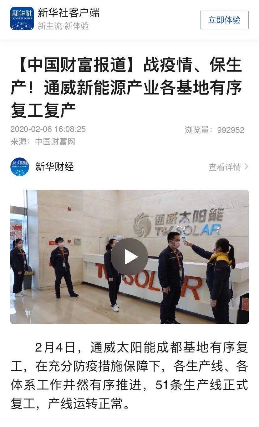 當(dāng)前,我國(guó)已進(jìn)入一手抓防控、一手抓發(fā)展的新階段。在十一屆全國(guó)政協(xié)常委、全國(guó)人大代表、通威集團(tuán)董事局劉漢元主席的高度重視和親自部署下,通威全面落實(shí)各項(xiàng)防控工作,保證各生產(chǎn)基地有序復(fù)工復(fù)產(chǎn),并不斷加碼新能源產(chǎn)業(yè)投資,進(jìn)一步夯實(shí)了核心競(jìng)爭(zhēng)力和龍頭地位,提振了行業(yè)信心。連日來(lái),包括央視《新聞聯(lián)播》在內(nèi)的央視重點(diǎn)欄目連續(xù)四次聚焦通威防疫復(fù)產(chǎn)工作。新華社連續(xù)兩次聚焦通威保生產(chǎn),促發(fā)展,新聞瀏覽量一篇超過一百萬(wàn),另一篇超五十萬(wàn)。此外,人民網(wǎng)、新京報(bào)、國(guó)際在線、投資者網(wǎng)、第一財(cái)經(jīng)、四川日?qǐng)?bào)、四川電視臺(tái)等國(guó)內(nèi)逾百家主流媒體、財(cái)經(jīng)媒體、行業(yè)媒體也發(fā)表新聞報(bào)道150余篇,高度評(píng)價(jià)通威有力防疫舉措,有序復(fù)工復(fù)產(chǎn),以及始終推進(jìn)新能源產(chǎn)業(yè)發(fā)展的工作成效!