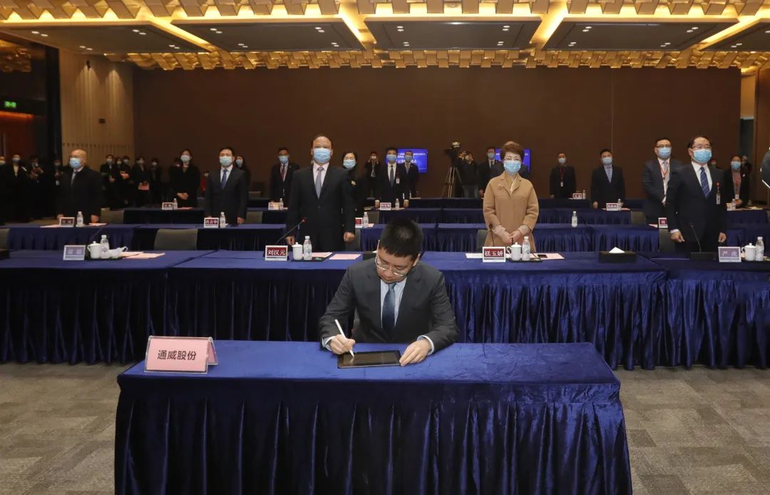 2月28日,通威股份與樂山市政府、五通橋區政府以“云簽約”方式正式簽訂《高純晶硅投資協議書》,宣布永祥樂山高純晶硅二期項目正式落戶樂山市五通橋區。樂山市委書記彭琳,市委副書記、市長張彤,市委副書記曾洪揚,市政府副市長廖克全,五通橋區委書記張國清,區委副書記、區長李良在樂山出席并見證項目簽約,通威集團董事局劉漢元主席,通威集團禚玉嬌總裁,通威股份董事長謝毅,通威股份副董事長嚴虎,通威股份董事、永祥股份董事長兼總經理段雍,通威股份總裁郭異忠,永祥股份財務總監袁仕華,永祥股份副總經理兼永祥新能源總經理李斌在成都通威國際中心出席簽約儀式。