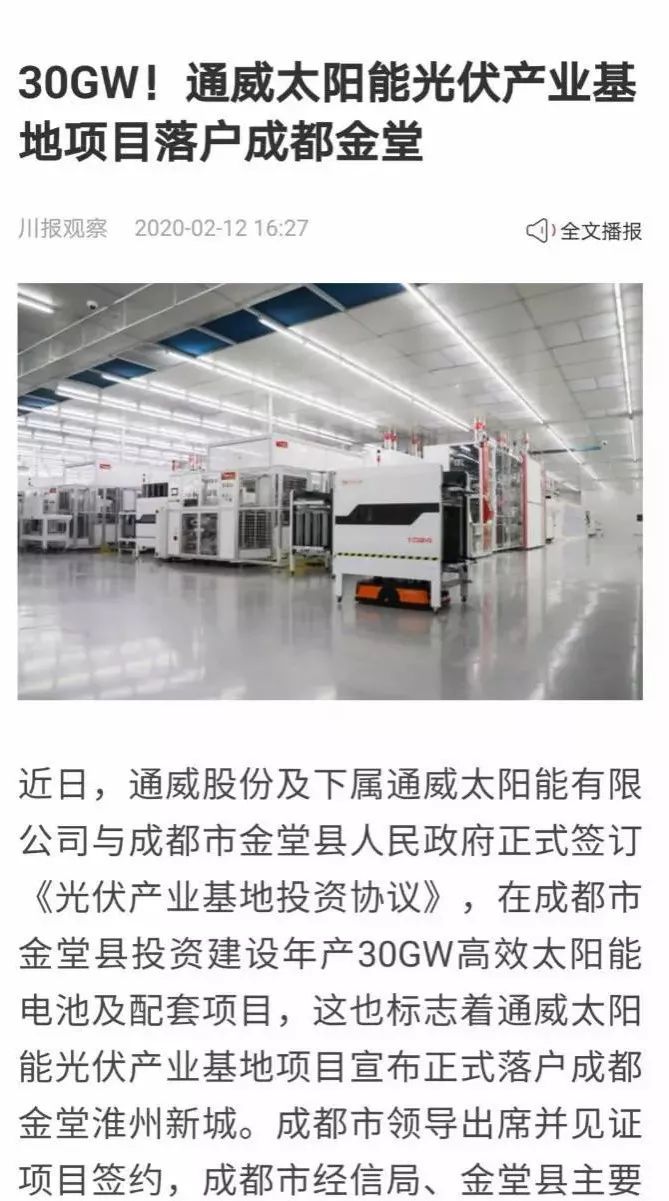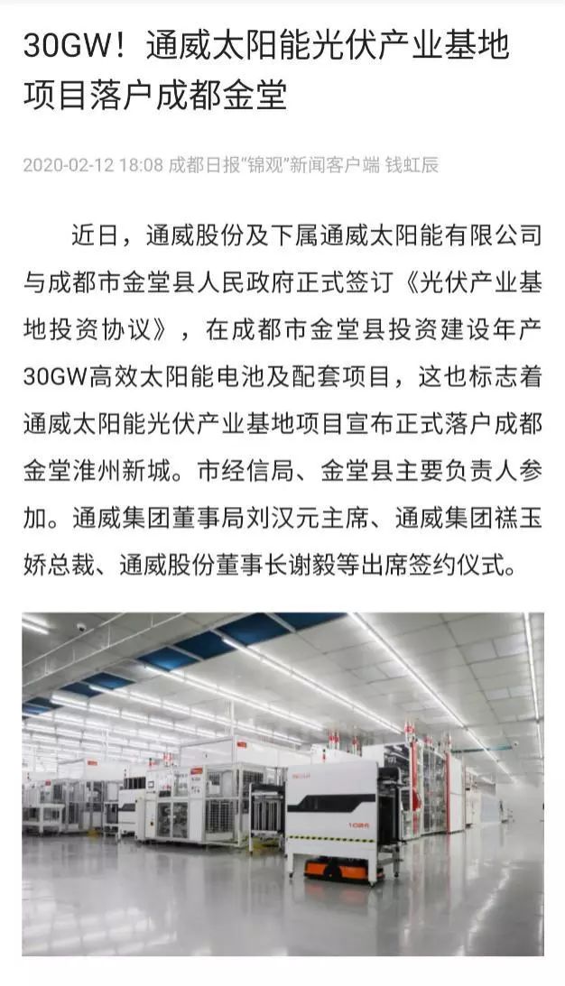 2月12日,川報觀察以“30GW!通威太陽能光伏產業基地項目落戶成都金堂”為題,詳細介紹通威項目相關情況,分析項目區域經濟效應。報道指出,通威太陽能光伏產業基地項目投資規模大、帶動效益強,將快速帶動上下游配套企業集聚,構建全球光伏產業生態圈,創新全球光伏產業生態鏈。