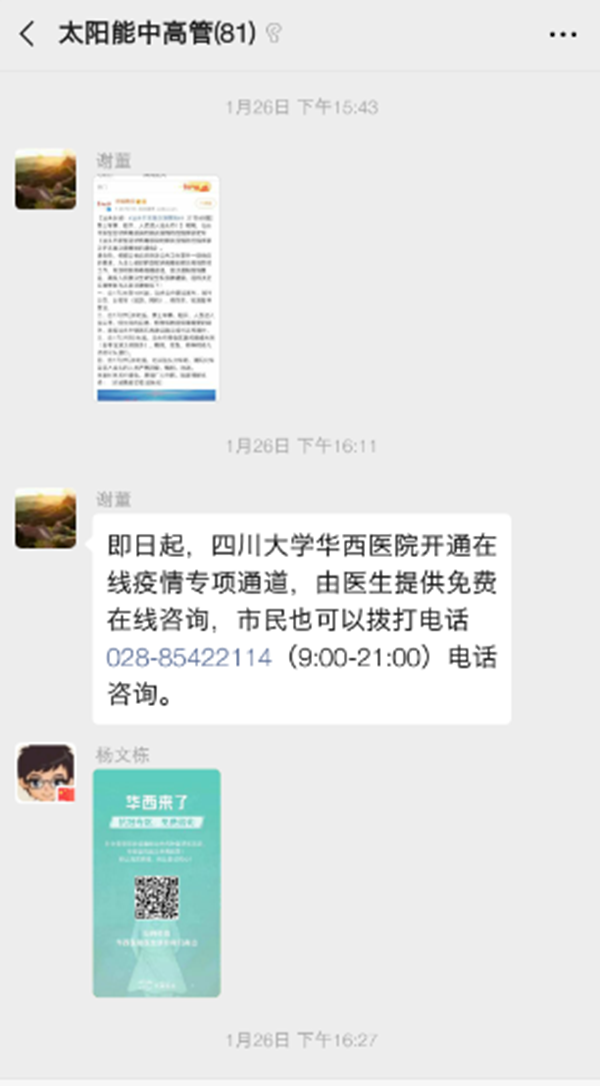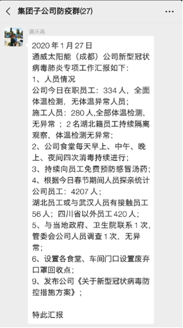 為打贏新型冠狀病毒肺炎防控攻堅戰,確保員工平安回家、安全返崗及放心工作,自疫情發生以來,通威太陽能采取系列防控“組合拳”,不斷筑牢病毒阻擊“防火墻”。在通威股份董事長謝毅的指示下,在1月22日成立應急防控小組基礎上,通威太陽能升級成立了疫情防控工作組。疫情防控工作組由謝毅董事長親自掛帥,擔任疫情防控工作組組長,負責組織、協調公司新型冠狀病毒感染的肺炎疫情應急處置工作。