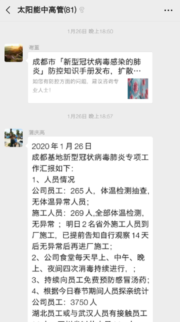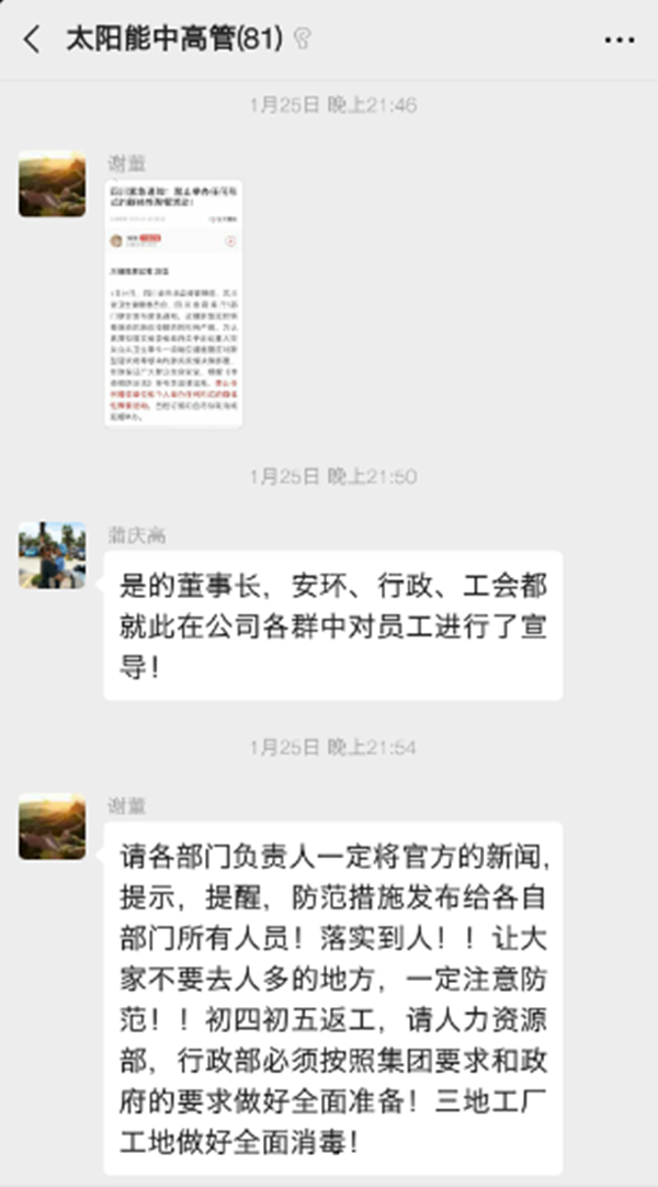 面對新型冠狀病毒突發疫情,通威股份董事長謝毅高度重視,要求立刻開始部署通威太陽能疫情防控工作,切實保障員工健康安全。