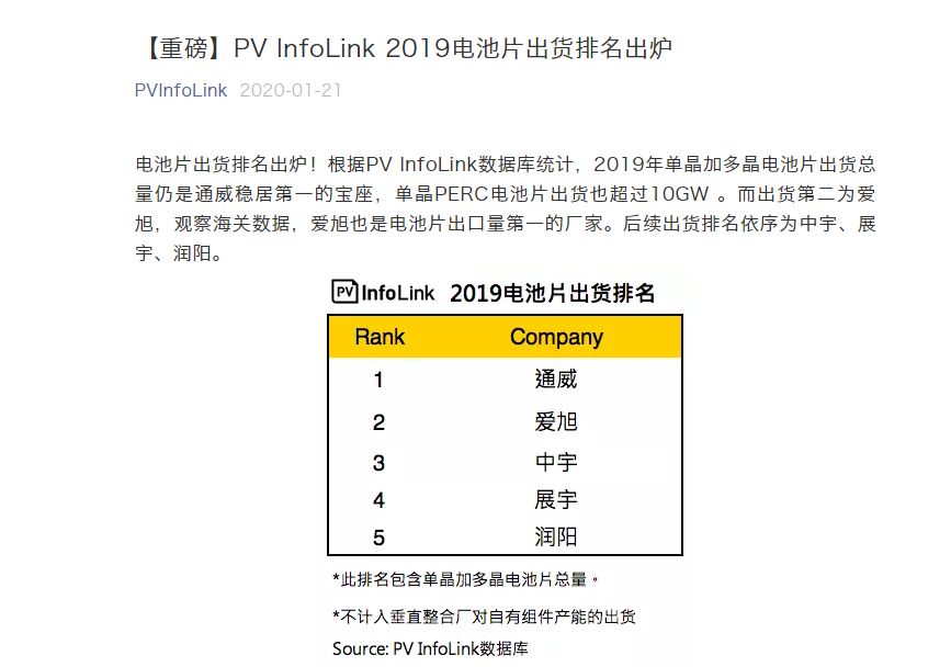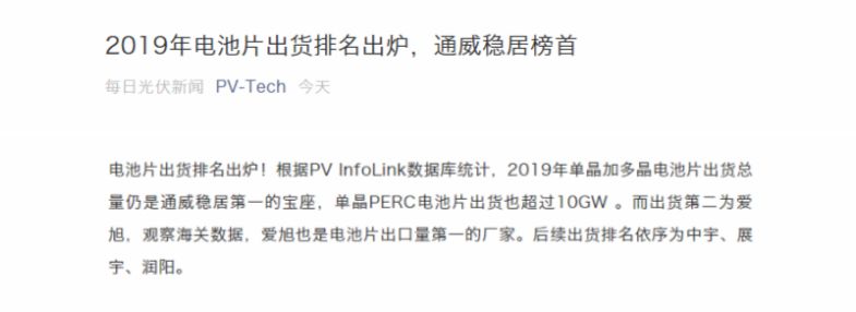 行業主流媒體聚焦通威太陽能2019電池片出貨全球第一
