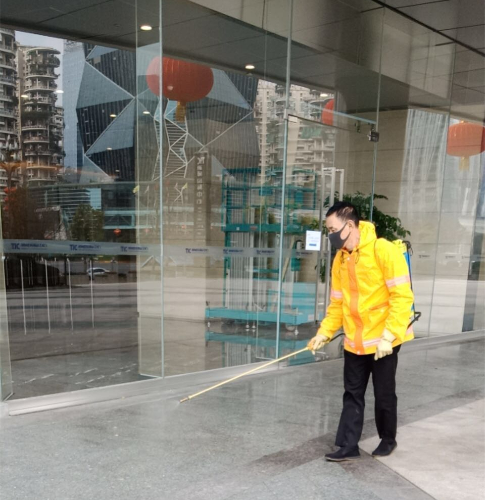 通宇物業(yè)對(duì)通威國(guó)際中心大樓大堂、外圍、電梯進(jìn)行全面消毒