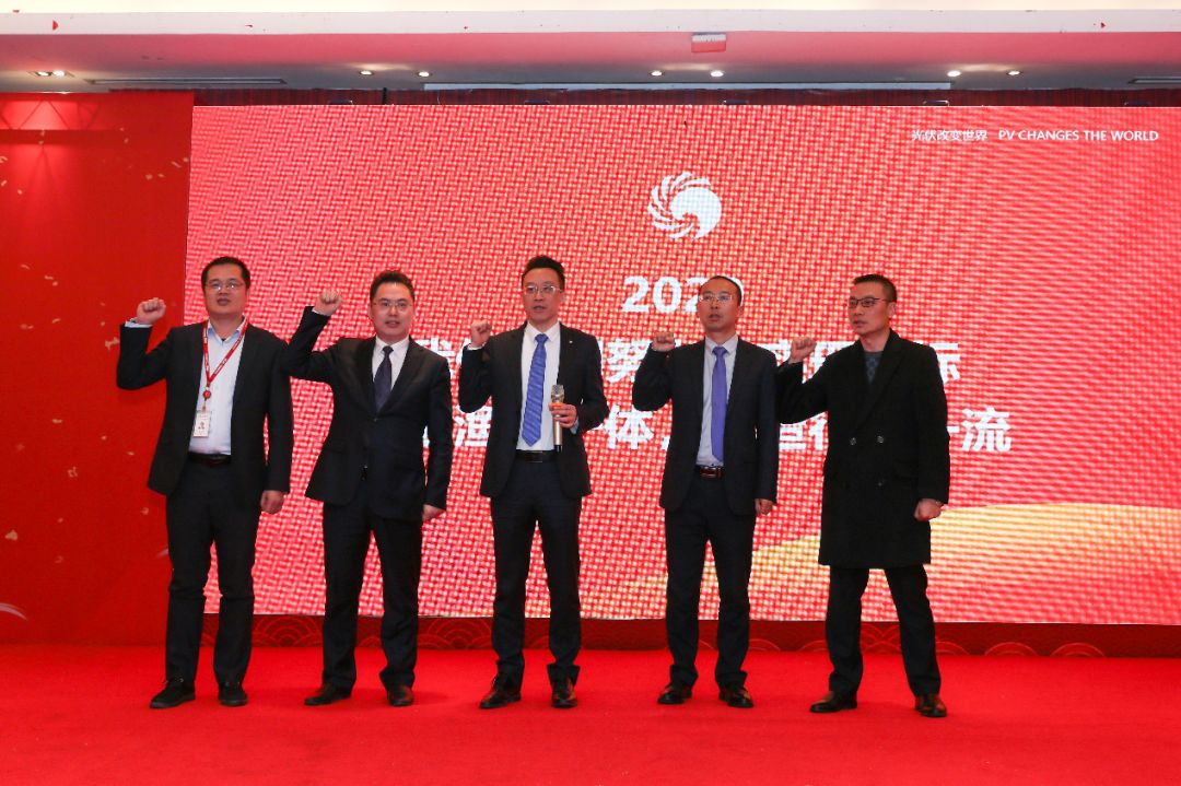 隨后,各終端公司負責人一同登臺,闡述2020年度各公司目標計劃,表示將認真貫徹戰略、高效執行,全力沖刺目標。在陳總的代領下,全體同仁慷慨握拳,莊重許下承諾——2020年,將共同努力,實現目標,推進“漁光一體”,打造行業一流!