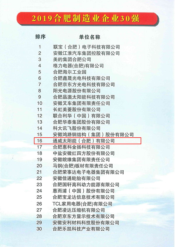 通威太陽能合肥公司 榮列合肥企業50強、合肥制造業企業30強榜單