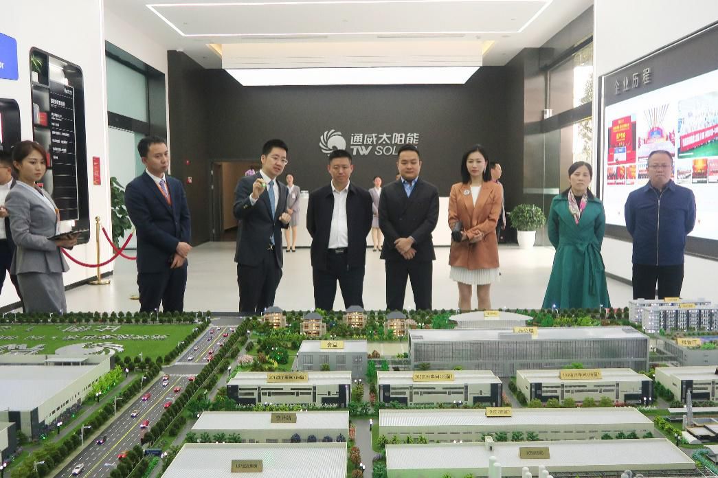 謝毅董事長向張榮書記介紹通威太陽能車間布局