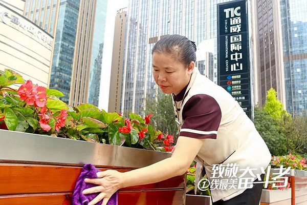 47歲的李茂群每天上班要騎20多分鐘自行車,入職通宇物業(yè)4年半以來,風(fēng)雨無阻。她一般早上7點(diǎn)之前就到崗,第一件事就是做大樓外圍的清掃工作。