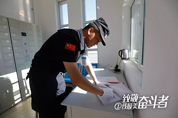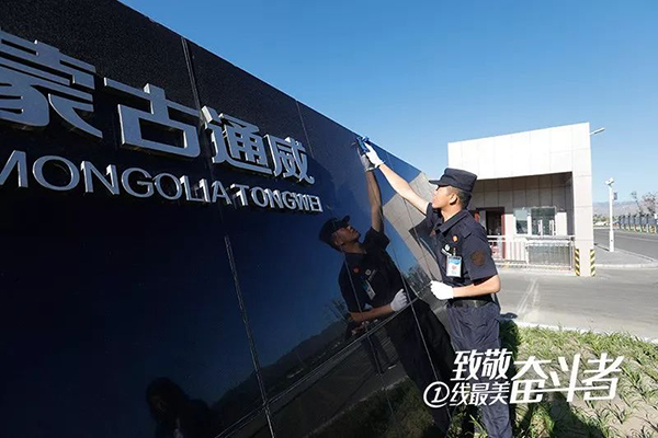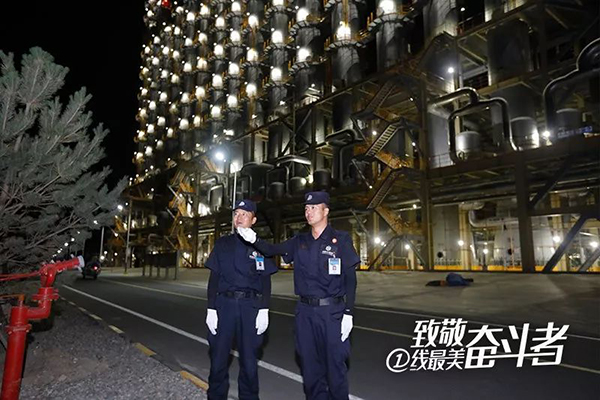 在2號門,魏志龍?zhí)嵝褕?zhí)勤人員拿兩條毛巾,一起擦起了刻有廠名的墻壁,并叮囑他:“每天不要只擦一次,風沙大。”大門的衛(wèi)生、車輛秩序,員工著裝規(guī)范都是他們的工作職責。看完各大門,魏志龍繼續(xù)巡查廠內(nèi)重點區(qū)域,這種巡查會持續(xù)到晚上及凌晨夜班。基地面積800多畝,為了保證基地安全,物業(yè)秩序隊22人,每天24小時不間斷要巡邏7次,每天至少3萬步。