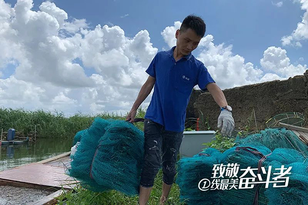 上午10點,氣溫升到36℃ ,一位養殖戶正要收蝦。“正好我來幫你收,順便看看吃了通威料的蝦長得怎么樣了。”說罷,朱俊杰熟練地戴上遮陽帽和手套,換上塑料拖鞋,挽起褲腿,騎著摩托車穿過崎嶇的塘間小路,跳上了收蝦的小船。“我們在拜訪養殖戶的同時,常常幫助他們做一些力所能及的事情,不僅是做客情,增進對養殖戶了解,同時也是不斷學習、不斷實踐的過程。”狹窄的小船蕩漾在波光粼粼的水面上,朱俊杰配合養殖戶從塘里收起了一籠一籠的蝦。