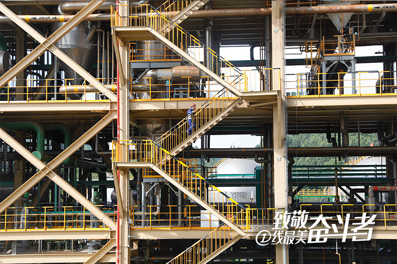 冷氫化工段主裝置區為兩棟鋼架結構樓,各有五層,由鋼架樓梯連接。陶勛貴的“走一圈”就是逐層巡查,大到設備裝置,小到角落的消防器材,陶勛貴都會走近觀察運行狀態。遇到大型裝置,陶勛貴需徒手攀爬直梯上去,用儀器檢查是否有“跑冒滴漏”。雖說還只是上午,但裝置區溫度已達到35°,一圈下來,陶勛貴已是汗流浹背。