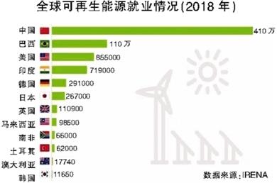 IRENA的報(bào)告指出,中國無疑是全球可再生能源就業(yè)市場(chǎng)的領(lǐng)導(dǎo)者,去年從業(yè)人數(shù)達(dá)到410萬,占全球就業(yè)人數(shù)總量的39%。