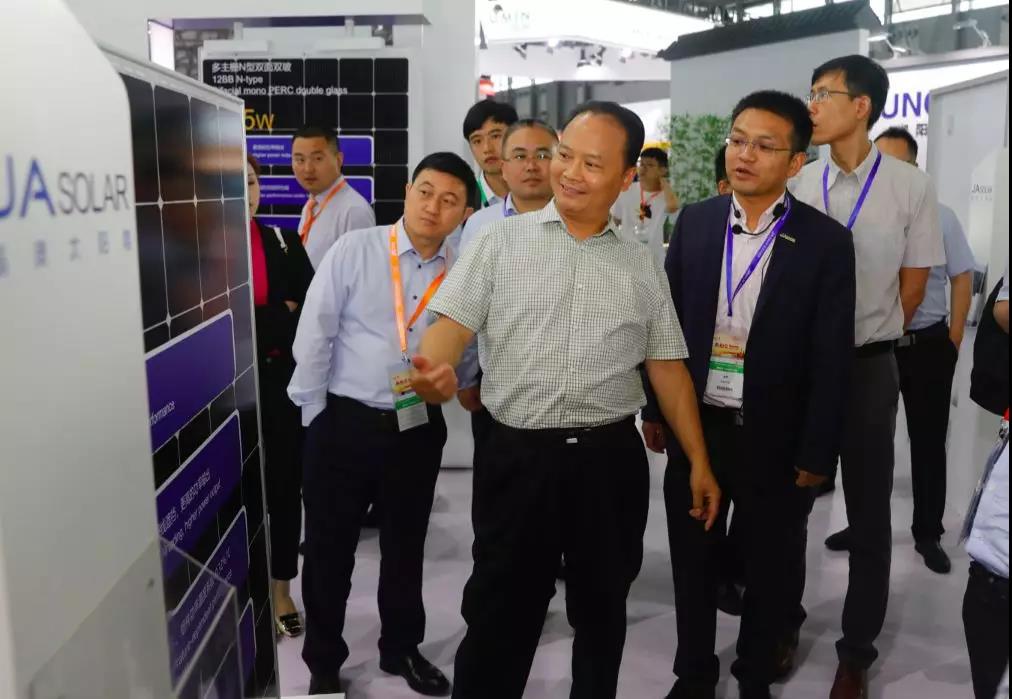 在通威展臺(tái),劉漢元主席仔細(xì)查看通威展示產(chǎn)品