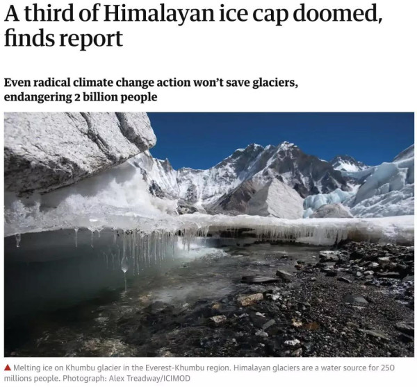 這項歷時5年,有350多名研究人員和政策專家參與的研究報告稱,冰川融化將帶來更多的空氣污染和更極端的天氣,河流流量的變化也會損害水力發電,影響城市供水系統和糧食種植,并在山區造成更多的侵蝕和滑坡。另外,隨著冰川的縮小,在包括珠穆朗瑪峰和喬戈里峰在內的山麓丘陵地帶形成了數百個危險的冰川湖泊,這些湖泊可能會決口并引發洪水。