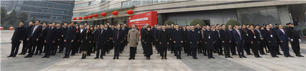 劉漢元主席等總部領(lǐng)導在大廳迎接新年后第一天上班的員工