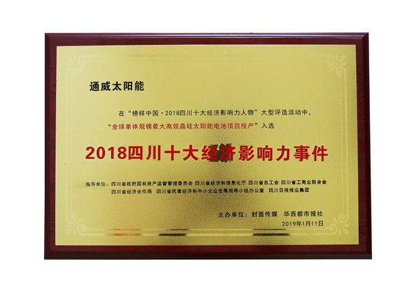 活動現(xiàn)場揭曉了“2018四川十大經(jīng)濟影響力人物”、“2018四川十大經(jīng)濟影響力事件”、“2018四川十大領(lǐng)軍企業(yè)”、“2018四川十大新經(jīng)濟領(lǐng)軍人物”四大榜單,并舉行了“助推四川經(jīng)濟高質(zhì)量發(fā)展”論壇。歷經(jīng)專家評審團近兩個月的審核、考察和市民投票環(huán)節(jié),通威太陽能成都三期“全球單體規(guī)模最大高效晶硅太陽能電池項目投產(chǎn)”入選“2018四川十大經(jīng)濟影響力事件”。