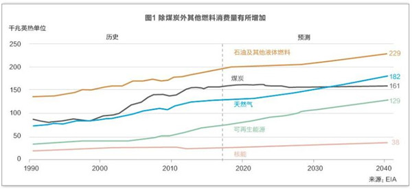 各機構預測,向更低碳的能源結構轉型將會持續。EIA認為,到2040年,世界范圍內,除煤炭外其他燃料消費量均呈增加態勢。BNEF預測,2017年至2050年期間,全球發電行業的煤炭消費量將下降56%。BP指出,可再生能源的持續快速增長正在導致有史以來最多元化的能源結構,2040年,石油、天然氣、煤炭和非化石能源預計將各提供世界能源的約四分之一,超過40%的能源需求增長將來自可再生能源。