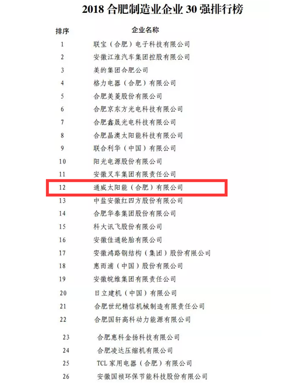 會議發布了2018合肥企業50強榜單、2018合肥制造業企業30強榜單、2018合肥服務業企業20強榜單、2018合肥建筑業企業20強榜單。通威太陽能合肥公司成功入選2018合肥企業50強榜單、2018合肥制造業企業30強榜單,分別從2017年第39位、第17位躍居第26位、第12位,通威太陽能合肥公司已連續多年入列雙強榜單,位次逐年攀升、增長勢頭強勁。