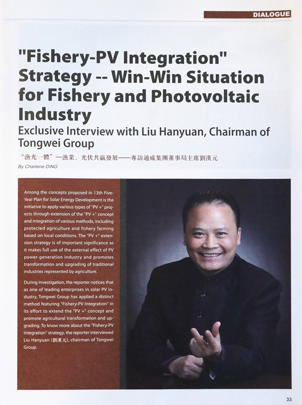 與此同時(shí),被稱為“中國(guó)第一刊”的國(guó)家級(jí)權(quán)威媒體《半月談》、新華社旗下的《經(jīng)濟(jì)參考報(bào)》、中國(guó)首本全英文能源雜志《CEFC China Energy Journal》紛紛聚焦通威。尤其是《CEFC China Energy Journal》推出題為“‘漁光一體’——漁業(yè)、光伏共贏發(fā)展”的劉主席全英文深度專訪,詳細(xì)報(bào)道了通威正大力推廣的“漁光一體”創(chuàng)新模式及通威新能源產(chǎn)業(yè)的戰(zhàn)略布局。報(bào)道指出,該模式實(shí)現(xiàn)了傳統(tǒng)水產(chǎn)養(yǎng)殖和清潔能源生產(chǎn)的有機(jī)結(jié)合,整合空間實(shí)現(xiàn)國(guó)土面積增值復(fù)用,提高單位面積每年輸出價(jià)值,對(duì)環(huán)境集約化發(fā)展有很大貢獻(xiàn)。