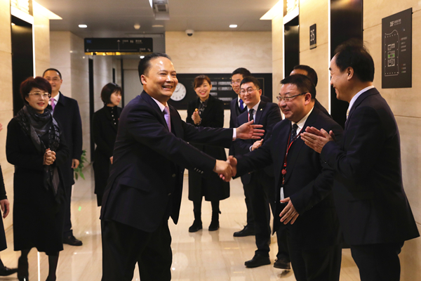 劉漢元主席等總部領導在大廳迎接新年后第一天上班的員工