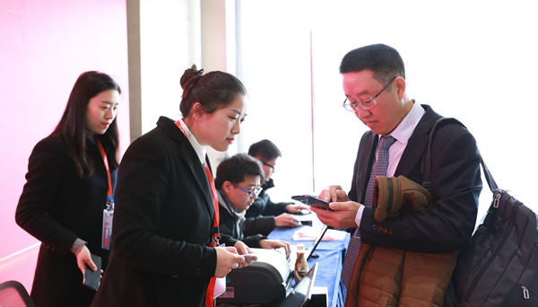 簽到處,工作人員提前準備了手機袋、二維碼掃描機,及時打印參會牌,迎接一線通威將士們回家。