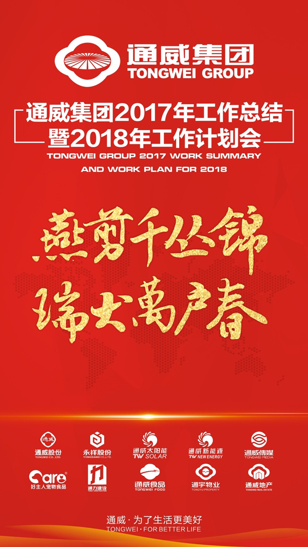 通威集團2017年工作總結暨2018年工作計劃會即將隆重召開。35年崢嶸歲月,35年砥礪奮進。2017年,在十一屆全國政協常委、通威集團董事局劉漢元主席的堅強領導下,全體通威人勠力同心、勵精圖治、奮發有為。集團農牧與新能源兩大主業聚勢聚焦、高效協同、成績卓著,取得了令行業內外震撼的歷史性突破與跨越,全集團朝著“三個世界級龍頭”的宏偉目標快速邁進!同時,集團適度多元化產業的地產、寵物食品、物業與傳媒等領域也蓬勃興盛、全線飄紅,集團各項事業興旺發達、蒸蒸日上!