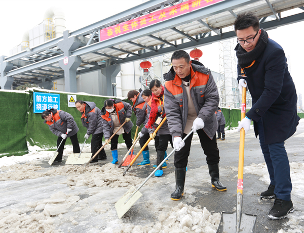 廠務(wù)人員清理車間外圍設(shè)備積雪
