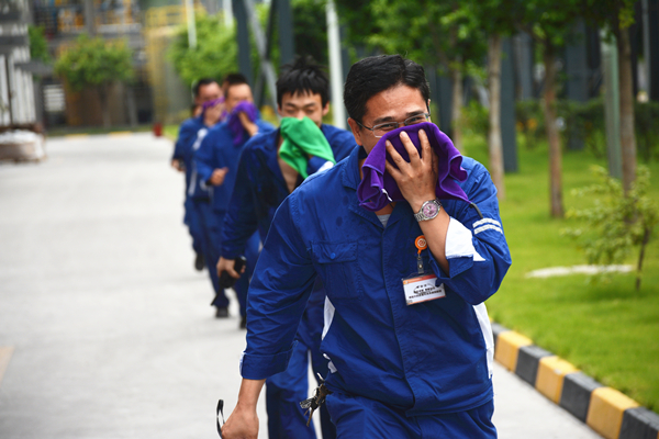 本次演練,模擬工業園區周邊化工廠出現氯化氫泄漏事故、硅材料生產區處于下風向被覆蓋范圍的情景。接公司應急辦指令,需要臨時進行向車間外圍周邊疏散的行動。本次演練由永祥硅材料副總經理廖洪現場主持并指揮,公司各部門、工段、工序、當班負責人和員工代表共計40余人參與。