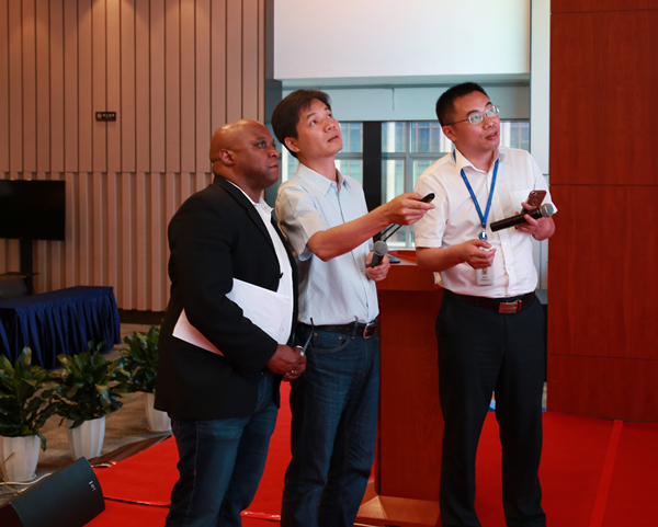 首批到達峰會現場的嘉賓是本次大會邀請的外籍重量級嘉賓,美國人工智能專家、東莞引進創業領軍人才Tony Huang,資深國際法律師、哈佛大學專家Jonathan K. Waldrop,硅谷科技創新、投資人顧問Cameron Nazeri,硅谷法規創新專家Jack Shaw。到達會議現場,幾位嘉賓便馬不停蹄開始彩排。專家Jonathan K. Waldrop更是把一行人晾在一邊,專注地與翻譯人員溝通明天主題演講的內容。