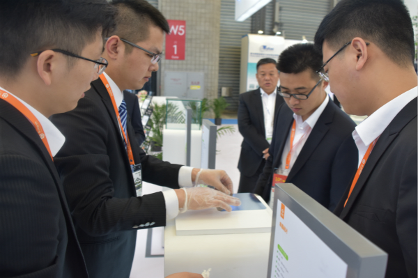 通威集團偌大的展廳流光溢彩,聲像和視覺畫面散發出強烈的吸引力,參觀來訪者絡繹不絕,永祥多晶硅及金剛線切割高效硅片樣品柜在臺前站立,迎接一雙又一雙認真注視的目光。4月19日上午9時,通威集團禚玉嬌總裁特意來到端莊簡潔的永祥展臺進行視察指導,向永祥員工表達了親切的問候,對永祥多晶硅產品、金剛線切割工藝高效硅片陳列展示情況表示關注,并與客戶朋友親切交流。期間,樂山市政府招商局相關領導來到通威展廳與禚總進行了會談。