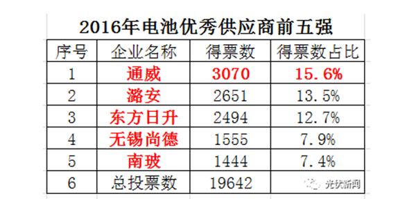 為進(jìn)一步提高公眾對光伏產(chǎn)業(yè)鏈上下游產(chǎn)品的認(rèn)知度,提升各環(huán)節(jié)企業(yè)品牌知名度,中國領(lǐng)先光伏新媒體“光伏新聞”于1月24日舉辦第一屆“2016年光伏產(chǎn)業(yè)鏈優(yōu)秀供應(yīng)商人氣排行”評選活動(dòng),通威太陽能電池片榮獲“2016年光伏產(chǎn)業(yè)鏈優(yōu)秀供應(yīng)商人氣排行”冠軍。