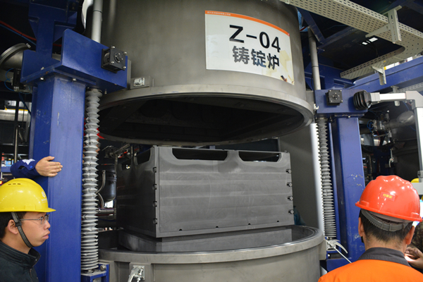 第一臺多晶鑄錠爐(Z-04)于13日進行投料,歷經高溫熔化,晶體生長,最終冷卻出爐。18日上午,在大家的注視下,爐體慢慢下降,經過高溫煅燒,被石墨擋板包裹的坩堝呈現(xiàn)在眼前,散發(fā)著大量的熱浪。經現(xiàn)場專業(yè)人員確認溫度后打開板蓋,一塊完整的硅錠表面展現(xiàn)出來,大家按捺不住內心的喜悅,共同見證這歷史性的一刻。