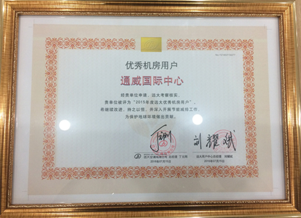 通威國際中心獲“2015年度遠大優(yōu)秀機房用戶”證書
