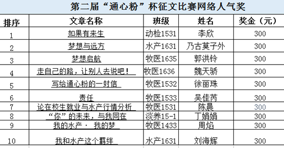 10月27日,第二屆“通心粉”杯征文比賽正式拉開帷幕。比賽期間,涌現(xiàn)出不少才華橫溢、文思敏捷的同學(xué),文藝抒懷、校園小清新、復(fù)古文言文等各種文風(fēng)都能輕松hold住。他們紛紛傳遞通心粉正能量,積極展示現(xiàn)代水產(chǎn)學(xué)子的別樣風(fēng)采。