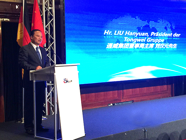 十一屆全國政協常委、通威集團董事局劉漢元主席作為川商企業代表,在致辭中指出,德國是一個高度發達的國家,經濟總量居全球第四,并長期位居歐洲首位,是名副其實的當今歐洲乃至世界的一流經濟強國。尤其是歐債危機期間,德國被公認為是帶領歐洲走出困境的核心力量??v觀全球發展歷史,在近五十年的世界經濟發展歷程中,德國一直是全球經濟的主要推動力量之一,并在汽車和機械制造、化工、電氣、新能源等行業處于世界先進水平,德意志民族的嚴謹認真、對細節把控近乎苛刻的工匠精神,一直受到世界各國人民的高度推崇!特別是近十年來,德國以高度前瞻性的發展眼光,引領了世界光伏產業的迅猛發展??梢哉f,光伏產業能取得今天的豐碩成果,德國功不可沒!尤其在2004年,德國開全球之先,先后頒布了針對光伏發電的《上網電價法》及一系列優惠貸款、資金補貼政策,由此催生了新一輪以光伏發電為代表的清潔能源發展的高潮。2012年5月26日,是一個注定會被載入史冊的日子。當天,德國全國光伏發電站峰值功率達到22GW,相當于當時德國正午用電負荷的50%,即光伏發電在當天中午提供了德國一半的電力,創造了人類光伏發展史上一個里程碑!劉主席強調,中德兩國在全球經濟中都占有十分重要的地位。同時,中德兩國在經濟等各個領域也存在高度的互補性。德國的科研、裝備制造水平領先全球,在很多國際標準的打造和建立上影響力巨大,而中國是全球最大的市場,近年來正全面加速經濟發展模式的轉型升級,兩國具有巨大的市場和技術合作空間。