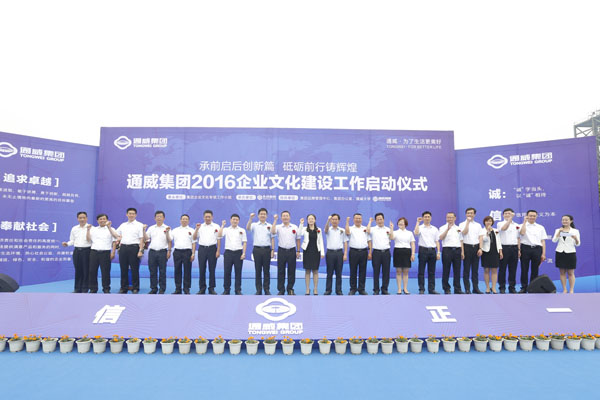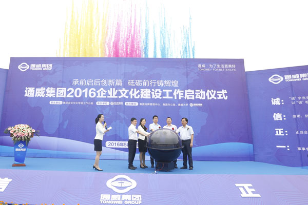 5月19日,通威集團2016企業文化建設工作啟動儀式在永祥多晶硅廠區隆重舉行。通威集團企業文化專項工作小組執行組長、集團副總裁黃其剛,通威集團企業文化專項工作小組執行組長、集團工會主席李思宇,通威股份董事、通威太陽能(合肥、成都)有限公司董事長謝毅,通威股份董事、永祥股份董事長兼總經理段雍,通威股份四川分公司總經理李德貴,永祥股份董事、永祥多晶硅執行總經理甘居富,永祥股份副總經理、永祥樹脂執行總經理周宗華,永祥股份副總經理、永祥硅材料總經理李斌,永祥水泥總經理杜炳勝,永祥股份能源總監徐洪濤等永祥股份高管團隊出席啟動儀式。來自集團與股份各分、子公司的通威文化專員及永祥股份的員工參加。