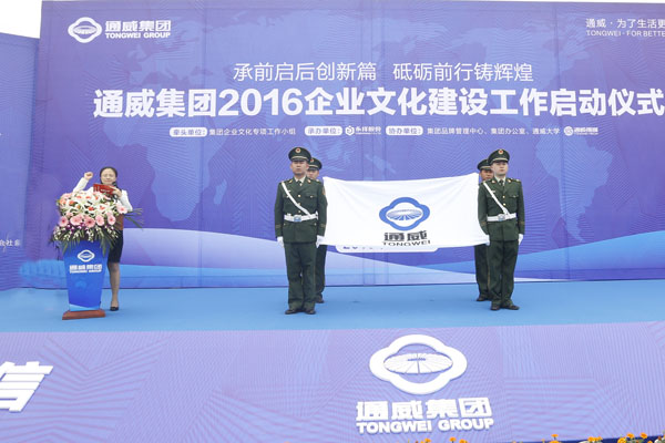 在通威文化宣誓儀式上,通威集團企業文化專項工作小組執行組長、集團工會主席李思宇領宣,在場的全體通威人起立,面對通威旗莊嚴宣誓:“堅守誠、信、正、一;追求卓越,奉獻社會;實現綠色產業協同發展;通威,為了生活更美好!”。