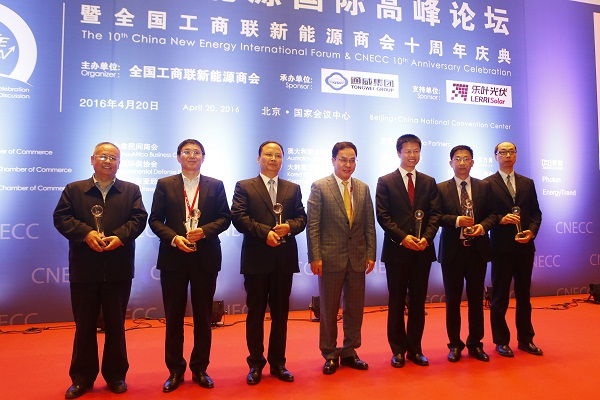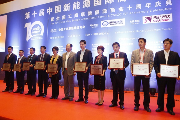 2016年恰逢《中國可再生能源法》頒布十周年,也是全國工商聯新能源商會成立的十周年,為此,論壇評選出了“中華新能源十年名人獎”、“中華新能源十年貢獻獎”等重磅獎項。通威集團董事局劉漢元主席榮獲“中華新能源十年名人獎”、通威集團榮獲“中華新能源十年貢獻獎”,禚玉嬌總裁代表集團上臺領獎。