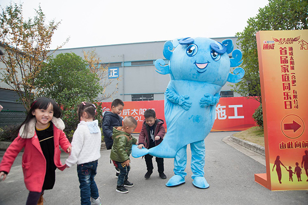 經(jīng)過兩周時間緊羅密鼓的籌備工作,11月21日當天,通威太陽能(合肥)公司廠區(qū)內(nèi)外裝飾一新,門口氣球高懸,落地桁架、指示牌、鮮花路引等營造出熱情活潑的整體氛圍。下午1點30分,載著員工家屬的大巴車徐徐駛?cè)霃S區(qū)。一組組家庭在小通仔的引領(lǐng)下走向家庭同樂日主會場。別致的蝴蝶Logo簽到墻、小通仔合影、精致的冷餐美食、游樂場般的活動場地……讓各家寶貝們興奮地蹦蹦跳跳。