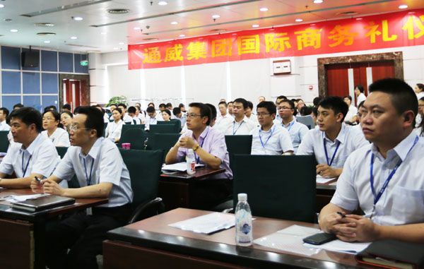 宣貫培訓(xùn)是本次員工形象提升工程的核心工作之一,根據(jù)參訓(xùn)人員的人數(shù),管理總部及入駐通威國際中心員工共近500人,分6個批次組織實施培訓(xùn)。7月3日下午,集團人力資源部組織集團總部及子公司共百余名員工開展了國際商務(wù)禮儀培訓(xùn)活動,正式拉開了首次培訓(xùn)工作的帷幕。
