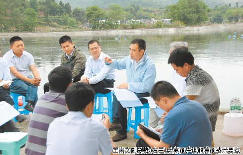 5月15日-16日上午,通威股份副總裁、市場營銷總監(jiān)兼技術(shù)總監(jiān)王尚文,股份副總裁、四川片區(qū)總裁兼四川通威總經(jīng)理陳平福,設(shè)施漁業(yè)工程研究所名譽所長吳宗文,水產(chǎn)市場部副部長楊建波等一行19人調(diào)研當?shù)厥袌觥M蹩倢λ拇ㄆ瑓^(qū)仁壽、雙流的6個示范點的工作開展、實施、進度情況,逐一進行了全面詳細地檢查。根據(jù)示范塘養(yǎng)殖條件,分別提出了每個示范點的養(yǎng)殖目標及相應(yīng)改進措施。