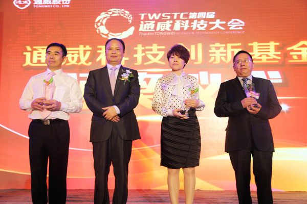 本次大會上,通威股份“通威科技創新基金”頒發的科技獎勵超過500萬元,表彰了2013年度對行業、對國家有重要或重大成果貢獻的項目及成果16項,涵蓋了水產、畜禽、動物保健、養殖示范推廣技術、檢測技術等各方面的技術成果,既有通威自主立項的共性技術和前瞻性技術攻關、營養與飼料研究、示范養殖模式推廣、新技術新產品開發等課題,也有國家和部、省、市重大科技項目。“通威科技創新基金”面向全球表彰農牧養殖領域的優秀科研成果,并對包括水產養殖業和畜禽養殖業在內的全行業科技研究者和成果應用者進行評選推介和資金扶持。大會上,四川農業大學周小秋教授榮獲2013年度“通威科技創新基金特別貢獻獎”,授予獎金100萬元;2013年度榮獲“國家科技進步二等獎”成果的“建鯉健康養殖的系統營養技術研究及其在淡水魚上的應用”,以及2013年度獲得“行業十大科技進步獎”成果的“池塘365高效健康養殖模式”分別獲得表彰獎勵100萬元。