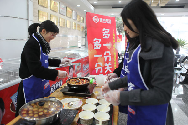 1月13日總部組織員工對環衛工人捐贈棉衣、棉被。1月15日,高新區工會何處長帶領肖家河街道40多位環衛工人到總部,下午2點剛剛從工作崗位上下班還沒有用午餐的環衛工人一坐下,集團工會李主席和工會其他成員為環衛工人送上了面包和溫熱的牛奶,通威食品的同事們忙著為他們煮著魚丸和魚餃,同事們把一碗碗熱氣騰騰魚丸送到每個環衛工人的手上,環衛工人們接過香噴噴的魚丸連聲道謝。第一次享受到別人為他們送上的美食,從他們臉上我們看到了幸福和喜悅。送走40多位環衛工人,集團工會李主席在環衛公司工會曾主席的帶領下將煮熟的魚丸送到了他們正在勞動的崗位上,一位環衛工人端著這熱氣騰騰的魚丸,激動的說“通威真是個不錯的公司,我們吃著這碗魚丸心理真的很溫暖”。同時,通威集團工會和高新區工會共同為肖家河街道200多名環衛工人每人贈送兩袋通威海南純生魚丸作為對環衛工人新春的慰問,希望他們能在社會各界的關懷下度過一個溫暖、祥和的春節。