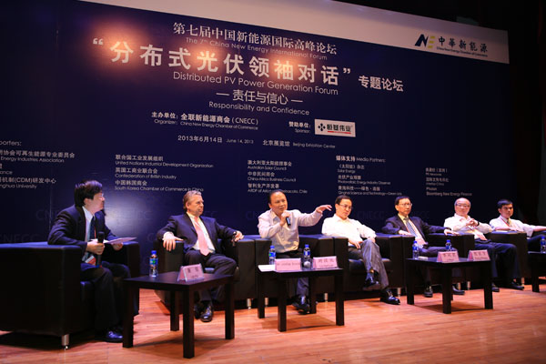 6月14日,第七屆中國新能源國際高峰論壇正式召開,與會嘉賓為中國新能源發(fā)展提出了諸多具有建設(shè)性的意見,并對中國新能源未來發(fā)展寄予厚望。在本場論壇的重頭戲————“分布式光伏領(lǐng)袖對話”環(huán)節(jié),針對“分布式光伏與國內(nèi)市場啟動”及“國內(nèi)企業(yè)‘走出去’戰(zhàn)略對策”兩大議題,各位企業(yè)家掀起了智慧風(fēng)暴,為行業(yè)發(fā)展提出許多卓越見解。