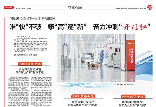 2月1日,《眉山日報》發(fā)布一篇題為“唯‘快’不破、攀‘高’逐‘新’,奮力沖刺‘開門紅’”的專題報道,聚焦通威太陽能眉山基地高質量發(fā)展與奮力沖刺“開門紅”。