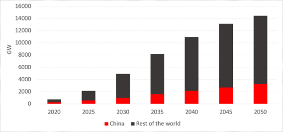 世界能源研究所曾計算2050年前中國和全球的光伏裝機量,光伏行業都將呈現出數倍甚至十余倍于今日的市場規模。其中,IEA數據預計,到2030年全球光伏裝機量需要增至2020年的近7倍,到2050年則將進一步擴大到近20倍。根據GEIDCO數據預測,到2030年,光伏裝機量需要達到2020年水平的4倍,到2050年則需要達到近13倍。