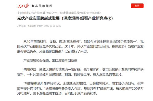 9月28日,《人民日報》發(fā)表題為“光伏產(chǎn)業(yè)實現(xiàn)跨越式發(fā)展”的文章,在報道中聚焦及點贊通威太陽能金堂基地智能制造水平及5G技術的創(chuàng)新應用。