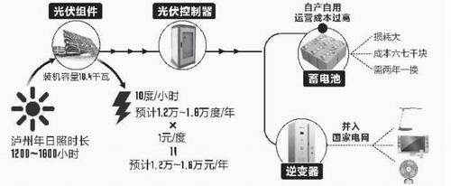 王坤介紹,氣象部門披露的數(shù)據(jù)顯示,多年以來,瀘州的年日照時(shí)長可達(dá)1200至1600小時(shí)。“根據(jù)我目前的裝機(jī)容量。太陽每照耀一小時(shí),即可發(fā)電10度。一年下來,可發(fā)電1.2萬度至1.6萬度。國家電網(wǎng)目前收購價(jià)為1元/度,這也意味著,單靠樓頂這個(gè)發(fā)電站,保守估計(jì),每年可實(shí)現(xiàn)收入1.2萬元。建設(shè)這個(gè)小型發(fā)電項(xiàng)目,投入為7萬余元。7年即可收回成本。由于使用年限可達(dá)20至25年,剩下的時(shí)間,則為純利潤。”