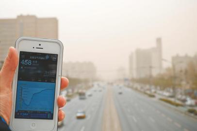 2月28日,北京宣武門外大街,手機顯示當日10時北京空氣污染指數458,空氣質量屬重度污染。新華社發